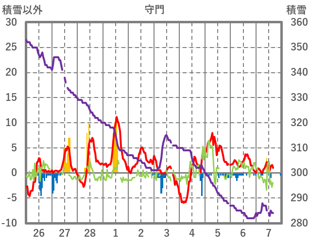 | 日 | 時 | 気温 | 降水 | 風向/風速 | 日照 | 積雪 | 降雪 |
