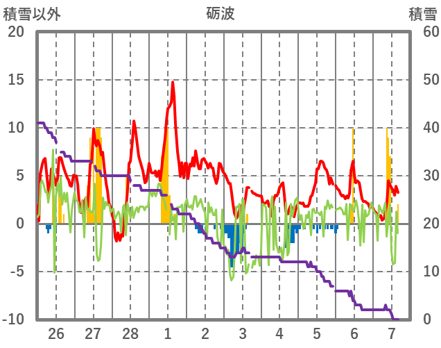 | 日 | 時 | 気温 | 降水 | 風向/風速 | 日照 | 積雪 | 降雪 |