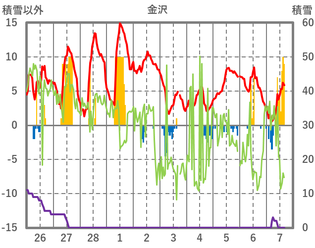 | 日 | 時 | 気温 | 降水 | 風向/風速 | 日照 | 積雪 | 降雪 |
