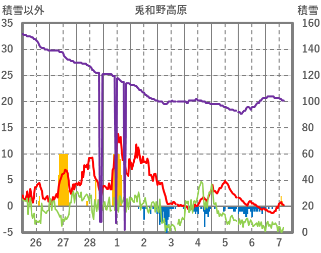 | 日 | 時 | 気温 | 降水 | 風向/風速 | 日照 | 積雪 | 降雪 |