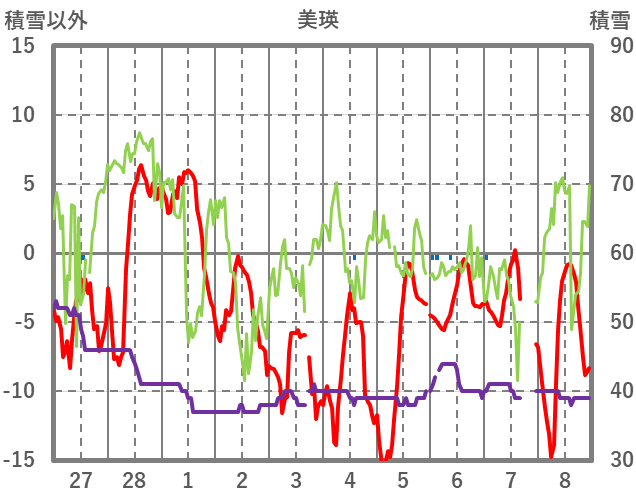 | 日 | 時 | 気温 | 降水 | 風向/風速 | 日照 | 積雪 | 降雪 |