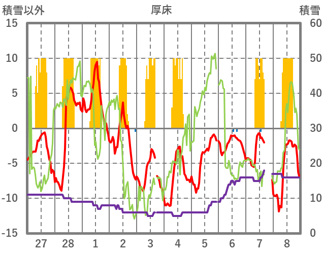 | 日 | 時 | 気温 | 降水 | 風向/風速 | 日照 | 積雪 | 降雪 |
