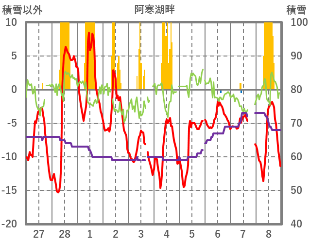 | 日 | 時 | 気温 | 降水 | 風向/風速 | 日照 | 積雪 | 降雪 |