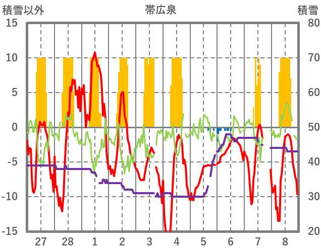 | 日 | 時 | 気温 | 降水 | 風向/風速 | 日照 | 積雪 | 降雪 |