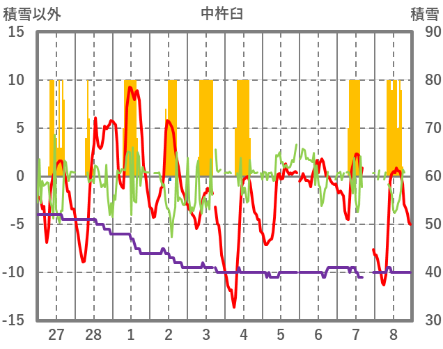 | 日 | 時 | 気温 | 降水 | 風向/風速 | 日照 | 積雪 | 降雪 |