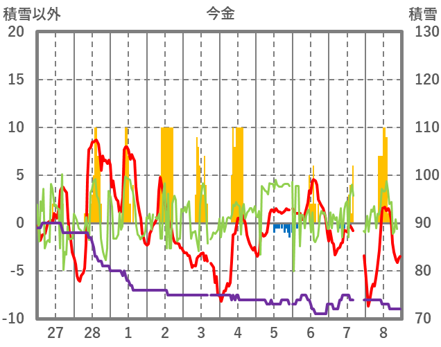 | 日 | 時 | 気温 | 降水 | 風向/風速 | 日照 | 積雪 | 降雪 |