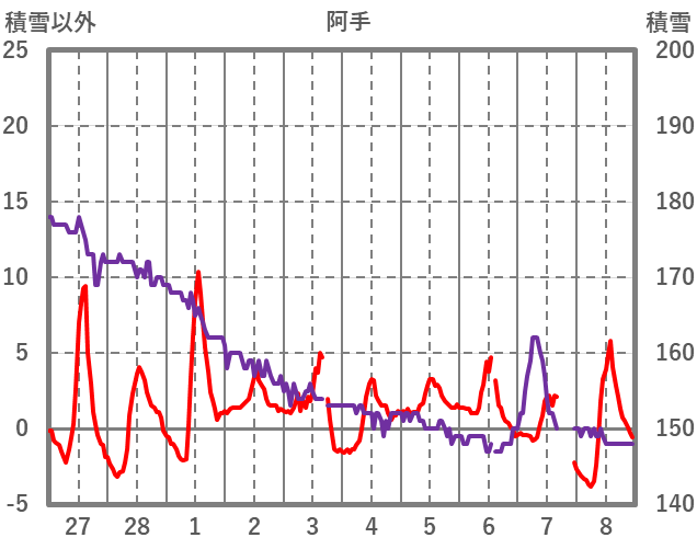 | 日 | 時 | 気温 | 降水 | 風向/風速 | 日照 | 積雪 | 降雪 |