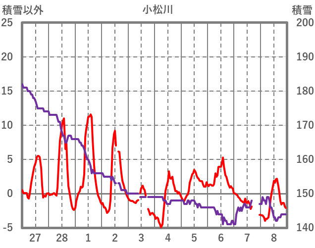 | 日 | 時 | 気温 | 降水 | 風向/風速 | 日照 | 積雪 | 降雪 |
