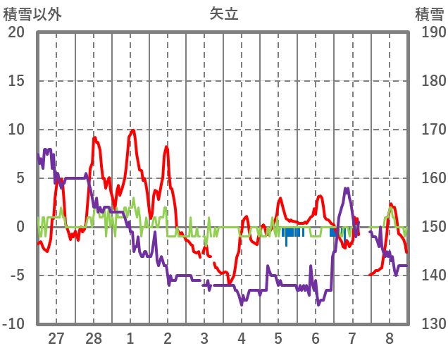 | 日 | 時 | 気温 | 降水 | 風向/風速 | 日照 | 積雪 | 降雪 |