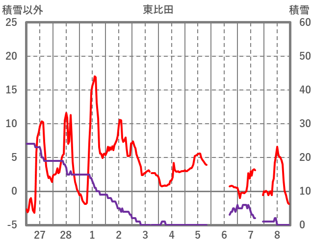 | 日 | 時 | 気温 | 降水 | 風向/風速 | 日照 | 積雪 | 降雪 |