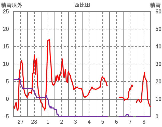 | 日 | 時 | 気温 | 降水 | 風向/風速 | 日照 | 積雪 | 降雪 |
