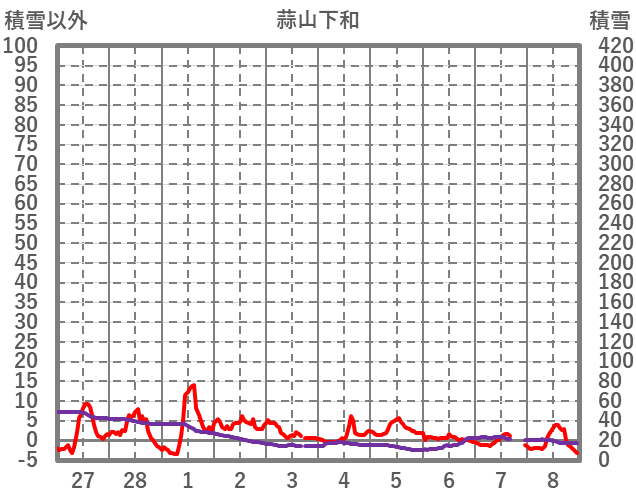| 日 | 時 | 気温 | 降水 | 風向/風速 | 日照 | 積雪 | 降雪 |