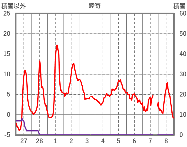 | 日 | 時 | 気温 | 降水 | 風向/風速 | 日照 | 積雪 | 降雪 |