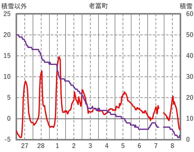 | 日 | 時 | 気温 | 降水 | 風向/風速 | 日照 | 積雪 | 降雪 |
