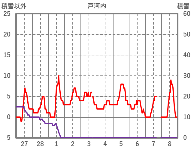 | 日 | 時 | 気温 | 降水 | 風向/風速 | 日照 | 積雪 | 降雪 |