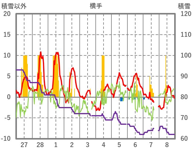 | 日 | 時 | 気温 | 降水 | 風向/風速 | 日照 | 積雪 | 降雪 |