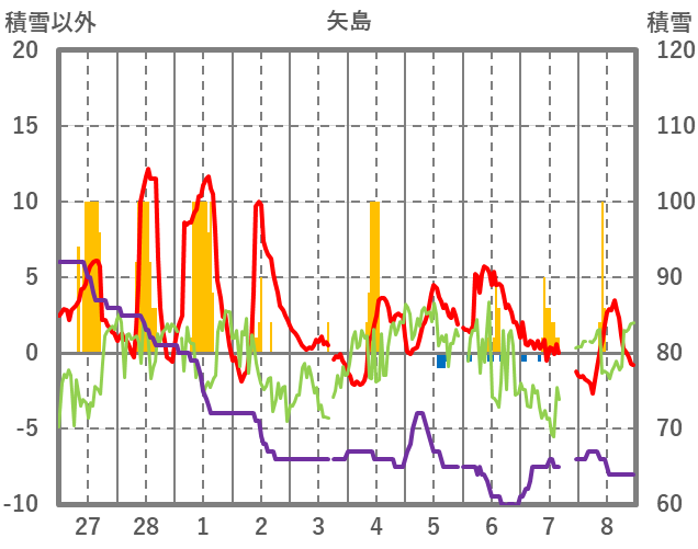 | 日 | 時 | 気温 | 降水 | 風向/風速 | 日照 | 積雪 | 降雪 |