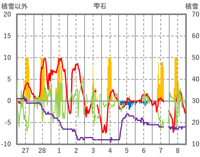 | 日 | 時 | 気温 | 降水 | 風向/風速 | 日照 | 積雪 | 降雪 |