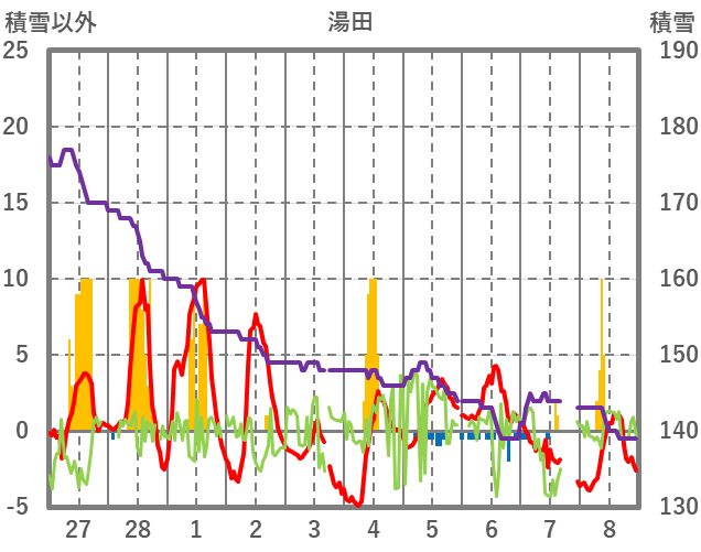 | 日 | 時 | 気温 | 降水 | 風向/風速 | 日照 | 積雪 | 降雪 |