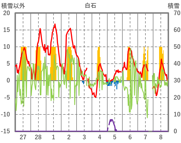 | 日 | 時 | 気温 | 降水 | 風向/風速 | 日照 | 積雪 | 降雪 |