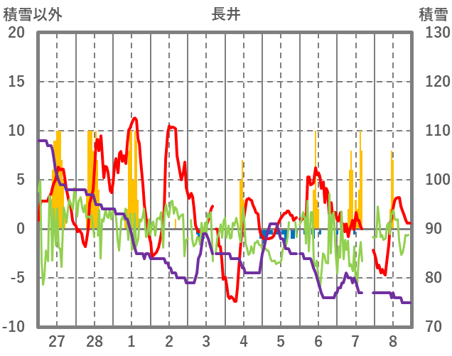 | 日 | 時 | 気温 | 降水 | 風向/風速 | 日照 | 積雪 | 降雪 |