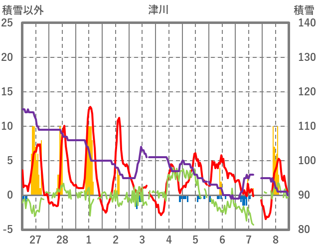 | 日 | 時 | 気温 | 降水 | 風向/風速 | 日照 | 積雪 | 降雪 |
