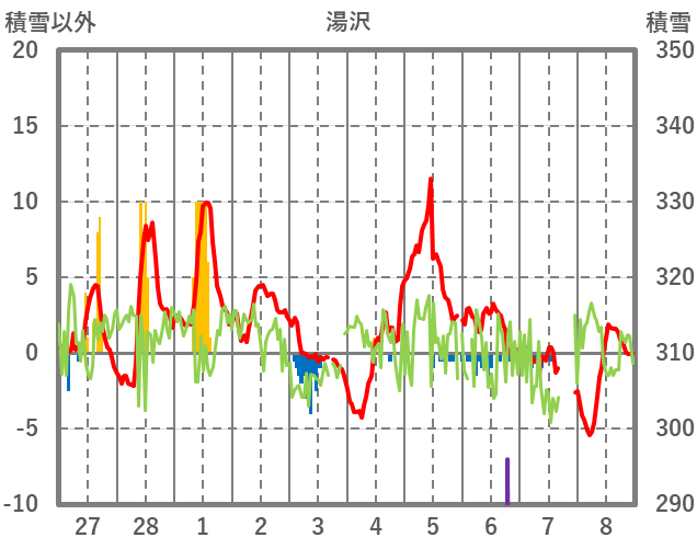 | 日 | 時 | 気温 | 降水 | 風向/風速 | 日照 | 積雪 | 降雪 |