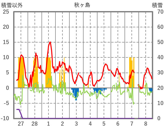 | 日 | 時 | 気温 | 降水 | 風向/風速 | 日照 | 積雪 | 降雪 |