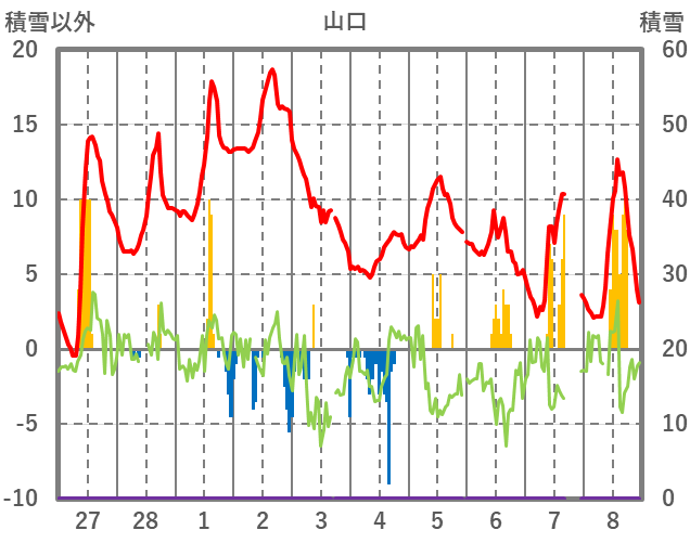 | 日 | 時 | 気温 | 降水 | 風向/風速 | 日照 | 積雪 | 降雪 |