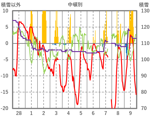 | 日 | 時 | 気温 | 降水 | 風向/風速 | 日照 | 積雪 | 降雪 |