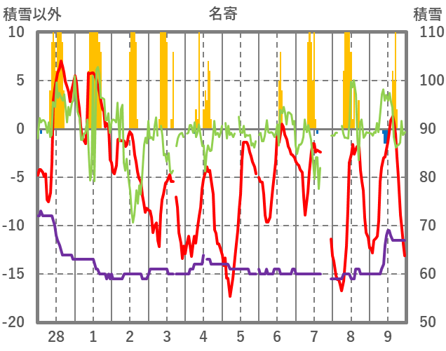 | 日 | 時 | 気温 | 降水 | 風向/風速 | 日照 | 積雪 | 降雪 |
