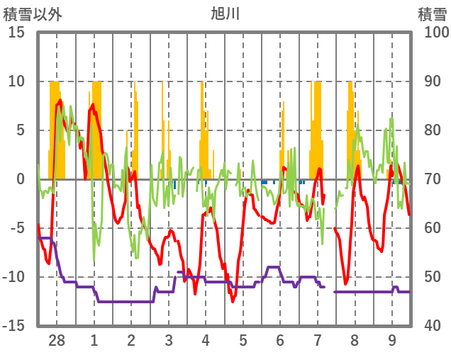 | 日 | 時 | 気温 | 降水 | 風向/風速 | 日照 | 積雪 | 降雪 |