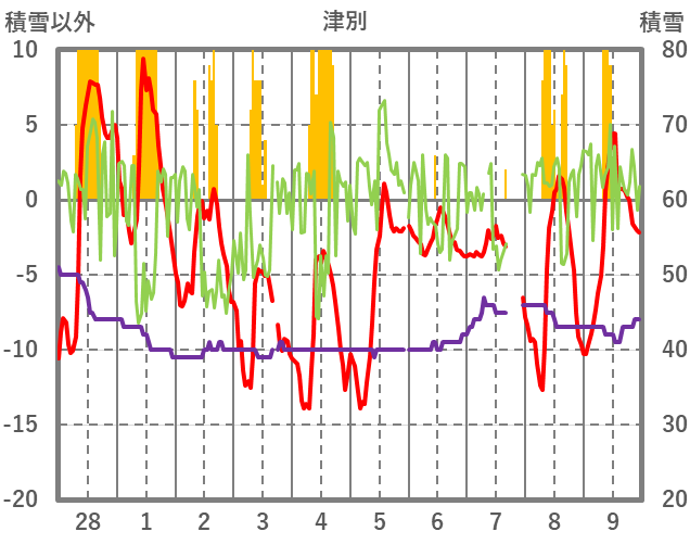 | 日 | 時 | 気温 | 降水 | 風向/風速 | 日照 | 積雪 | 降雪 |