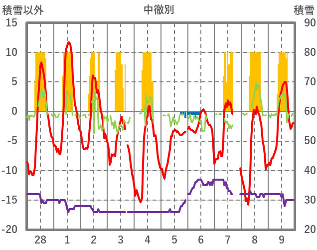 | 日 | 時 | 気温 | 降水 | 風向/風速 | 日照 | 積雪 | 降雪 |