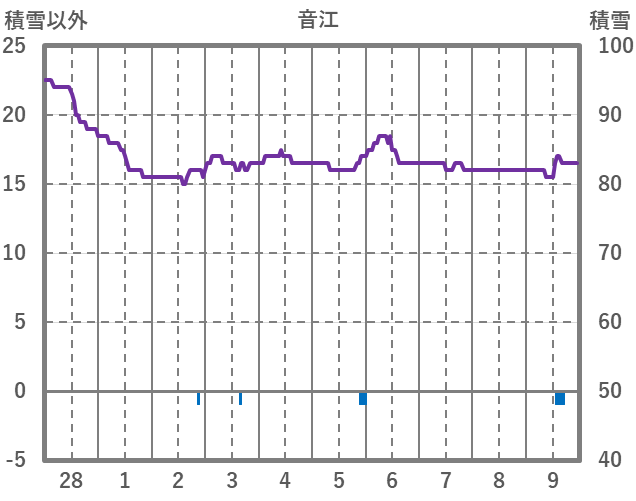 | 日 | 時 | 気温 | 降水 | 風向/風速 | 日照 | 積雪 | 降雪 |