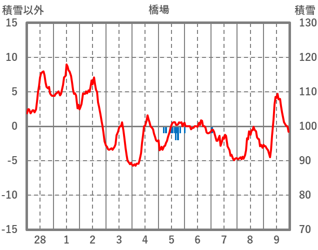 | 日 | 時 | 気温 | 降水 | 風向/風速 | 日照 | 積雪 | 降雪 |