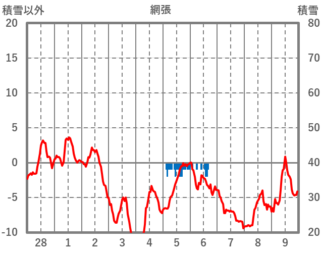 | 日 | 時 | 気温 | 降水 | 風向/風速 | 日照 | 積雪 | 降雪 |