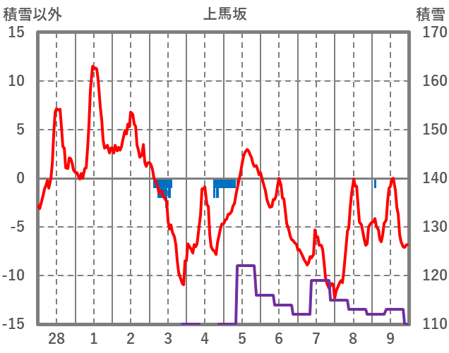 | 日 | 時 | 気温 | 降水 | 風向/風速 | 日照 | 積雪 | 降雪 |