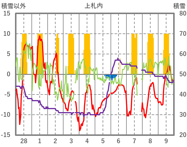 | 日 | 時 | 気温 | 降水 | 風向/風速 | 日照 | 積雪 | 降雪 |