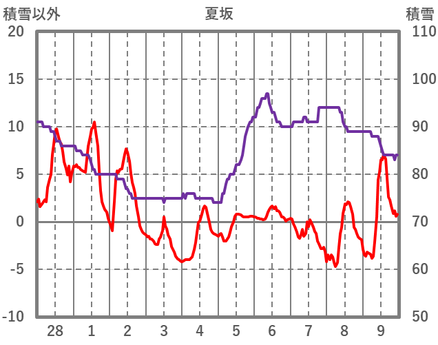 | 日 | 時 | 気温 | 降水 | 風向/風速 | 日照 | 積雪 | 降雪 |