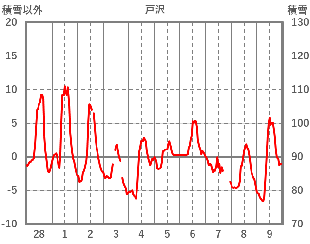 | 日 | 時 | 気温 | 降水 | 風向/風速 | 日照 | 積雪 | 降雪 |