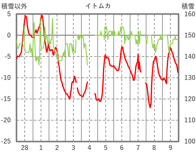 | 日 | 時 | 気温 | 降水 | 風向/風速 | 日照 | 積雪 | 降雪 |