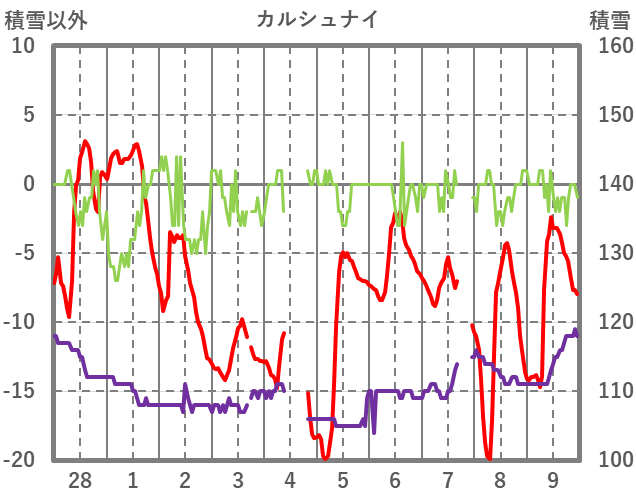 | 日 | 時 | 気温 | 降水 | 風向/風速 | 日照 | 積雪 | 降雪 |