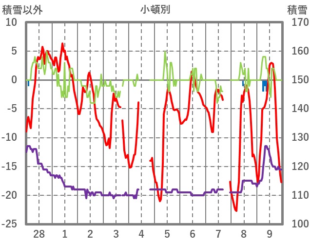 | 日 | 時 | 気温 | 降水 | 風向/風速 | 日照 | 積雪 | 降雪 |