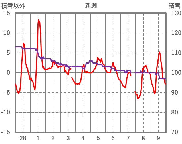 | 日 | 時 | 気温 | 降水 | 風向/風速 | 日照 | 積雪 | 降雪 |