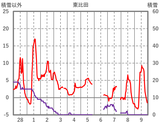 | 日 | 時 | 気温 | 降水 | 風向/風速 | 日照 | 積雪 | 降雪 |