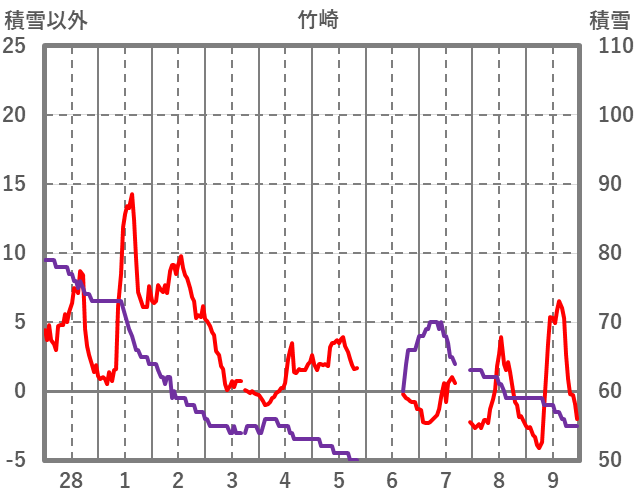 | 日 | 時 | 気温 | 降水 | 風向/風速 | 日照 | 積雪 | 降雪 |