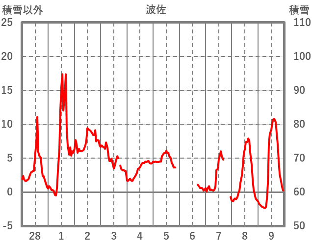 | 日 | 時 | 気温 | 降水 | 風向/風速 | 日照 | 積雪 | 降雪 |