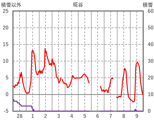 | 日 | 時 | 気温 | 降水 | 風向/風速 | 日照 | 積雪 | 降雪 |