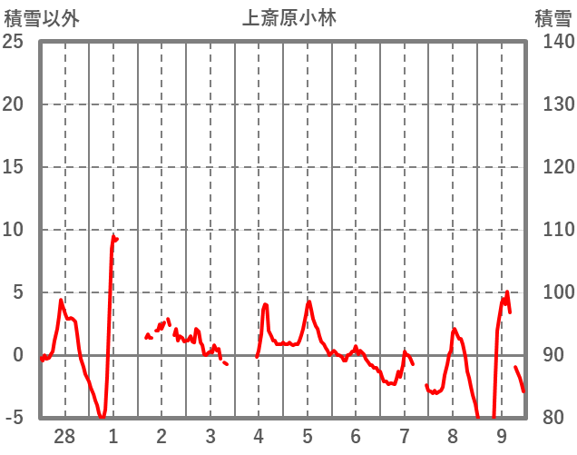 | 日 | 時 | 気温 | 降水 | 風向/風速 | 日照 | 積雪 | 降雪 |